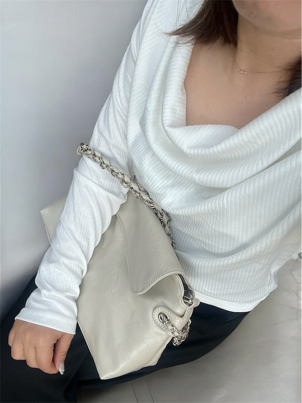 ドレープオフショルダーカットソーは、エレガンスとリラックス感を兼ね備えたデザインで、デイリースタイルを格上げするアイテムです。オフショルダーのデザインが肩周りをすっきりと見せ、ドレープが美しく流れることで、華やかさを演出します。また、柔らかな素材感は着る人を包み込み、快適な着心地をもたらします。