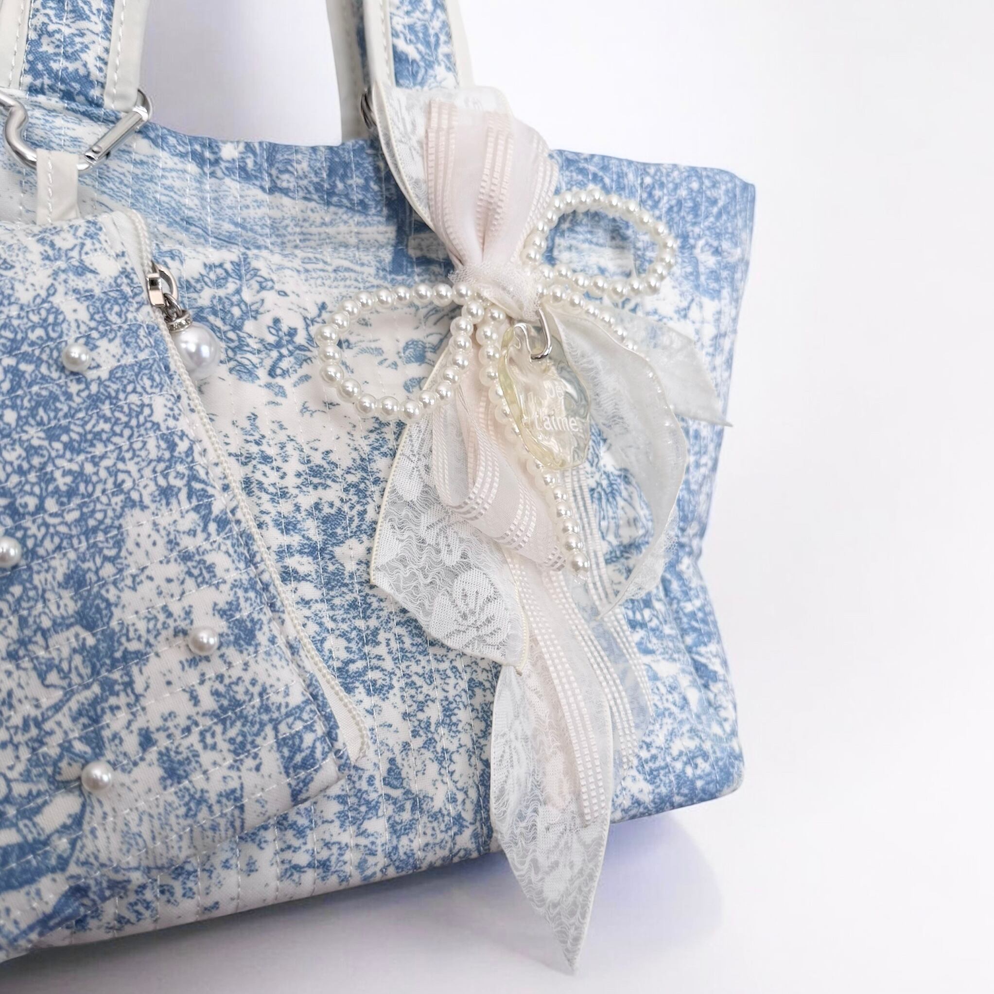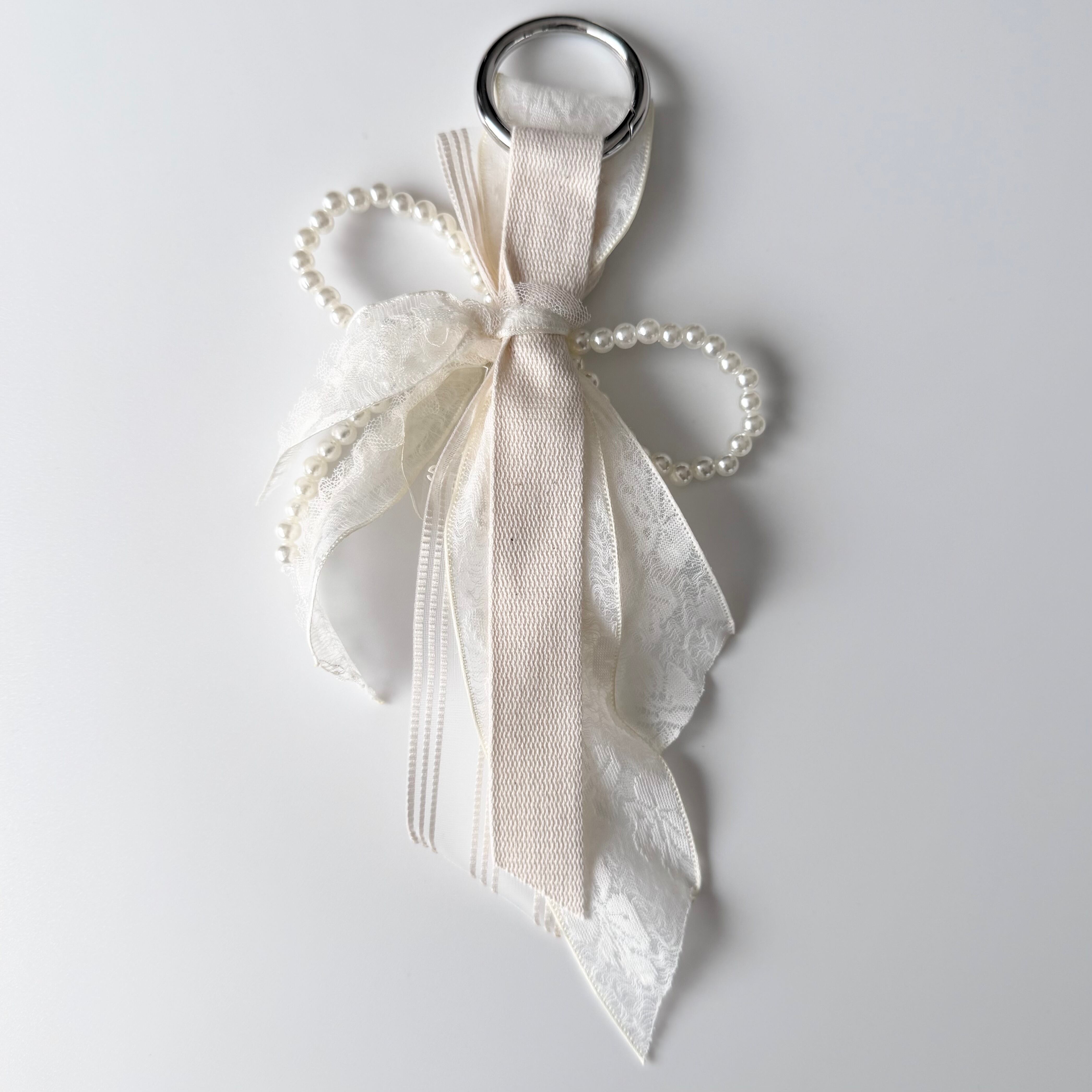このリボンチャームは、繊細なホワイトレースとパールリボンを組み合わせたエレガントなデザインが特徴です。カラビナが付属しておりどんなアイテムにも簡単に取り付けられ、あなたのスタイルに華やかなアクセントをプラスします♪