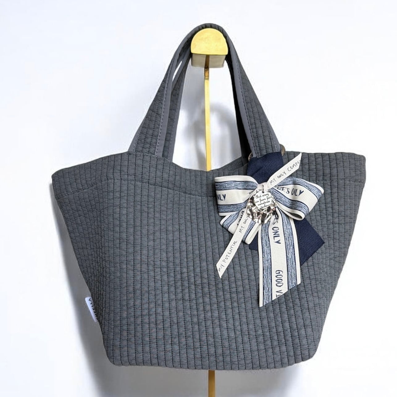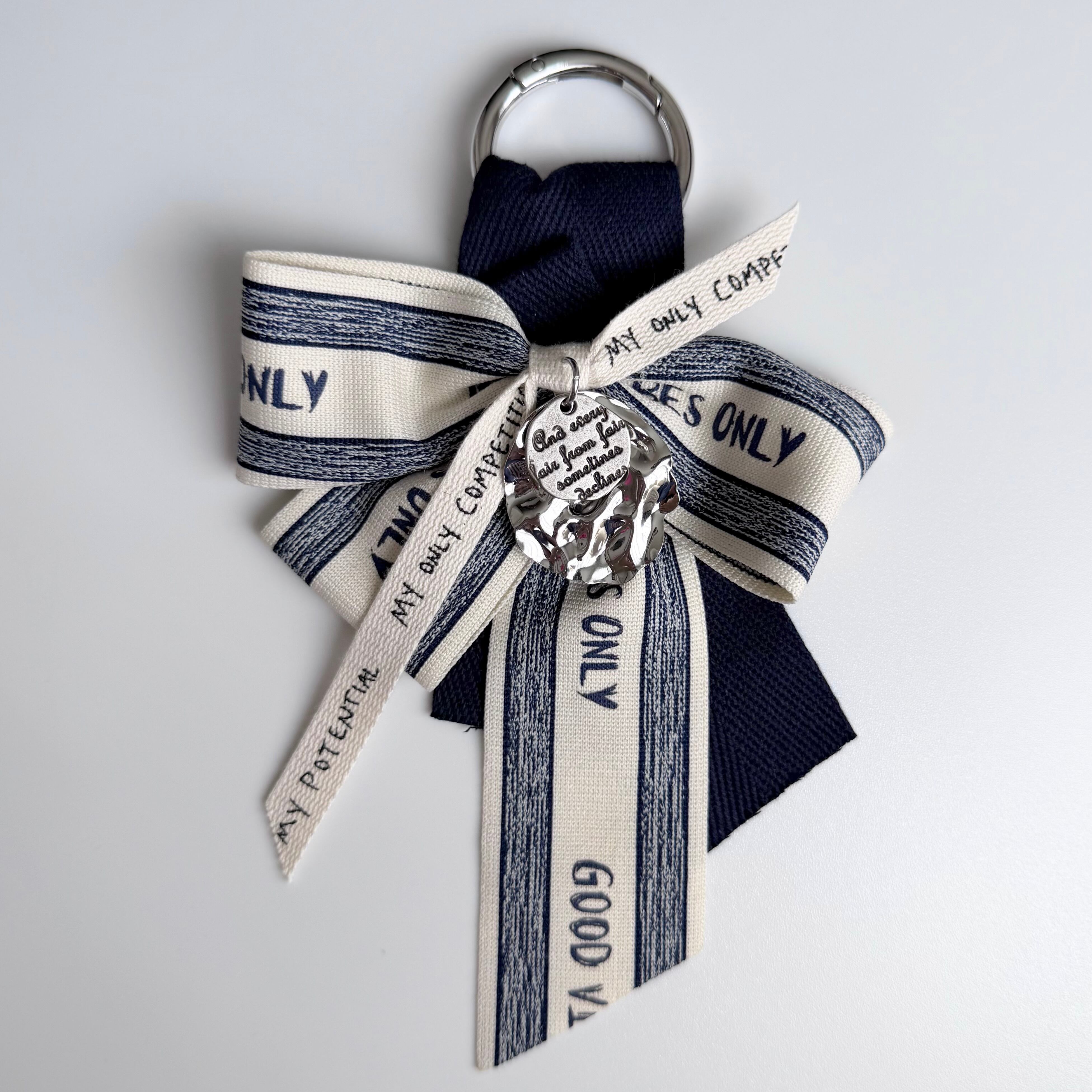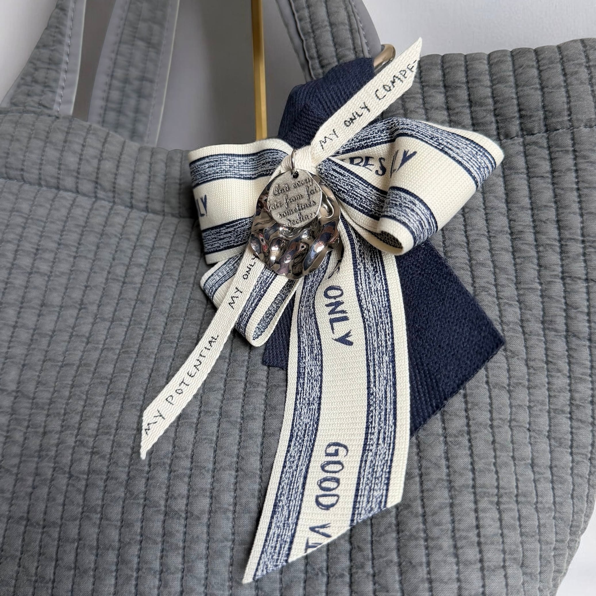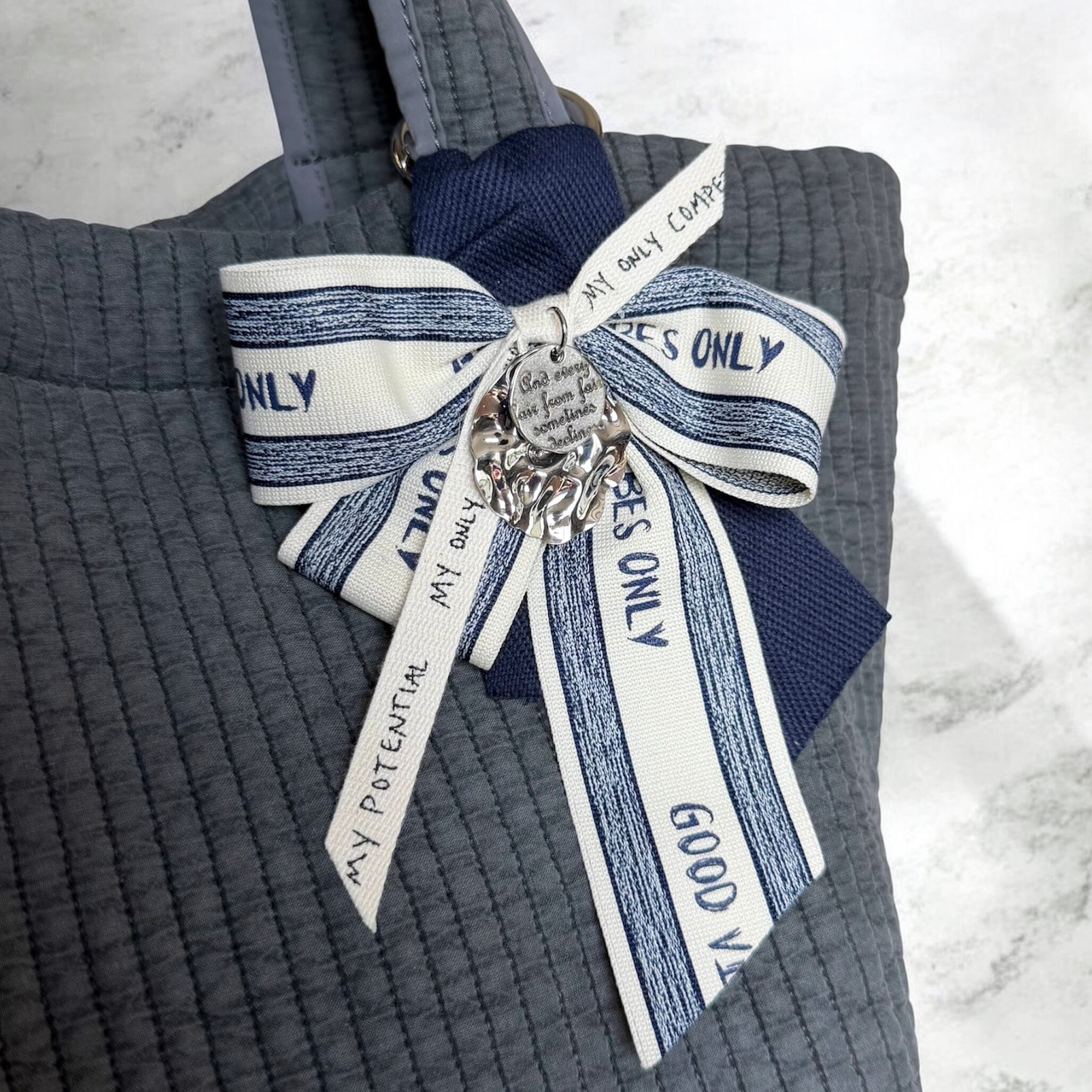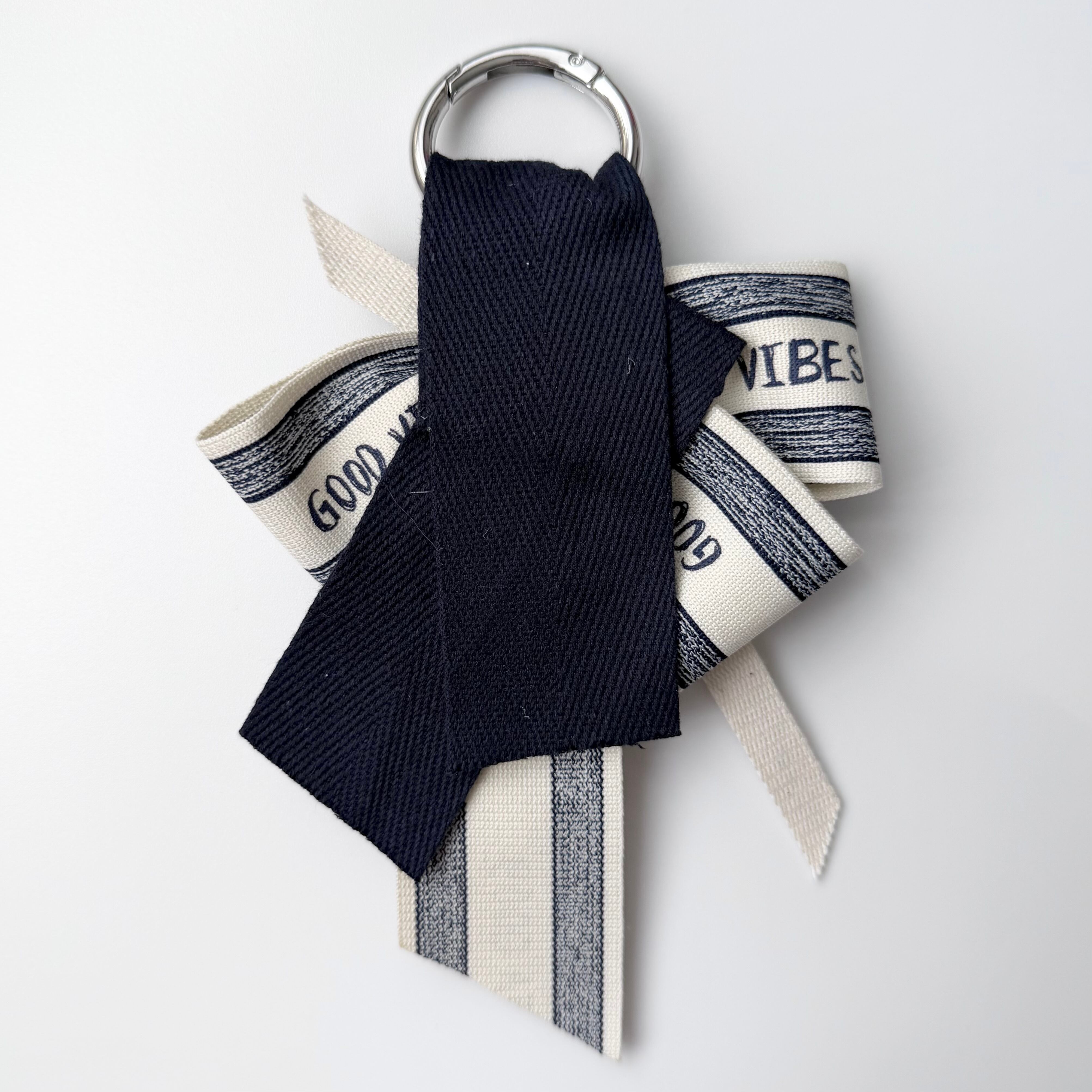 このリボンチャームは、深いネイビーカラーとベージュリボンの絶妙な組み合わせが特徴です。英字シルバープレートのチャームとカラビナが付属しており、あなたのアイテムに華やかなアクセントを加えます♪シンプルなコーディネートにも特別なスタイルにもマッチするため、幅広いシーンでご利用いただける便利なアイテムです。