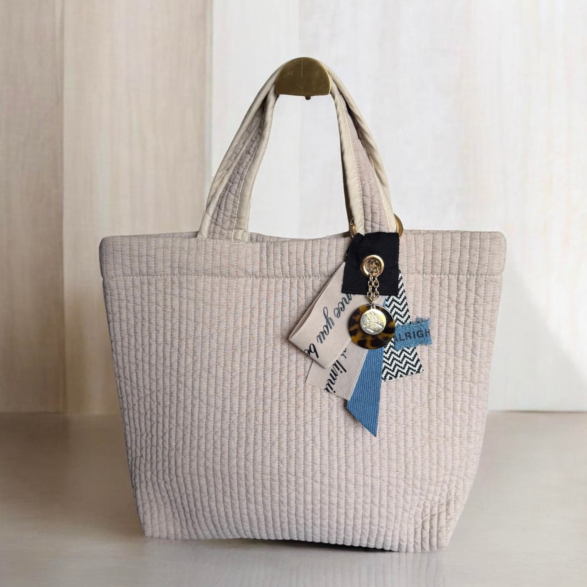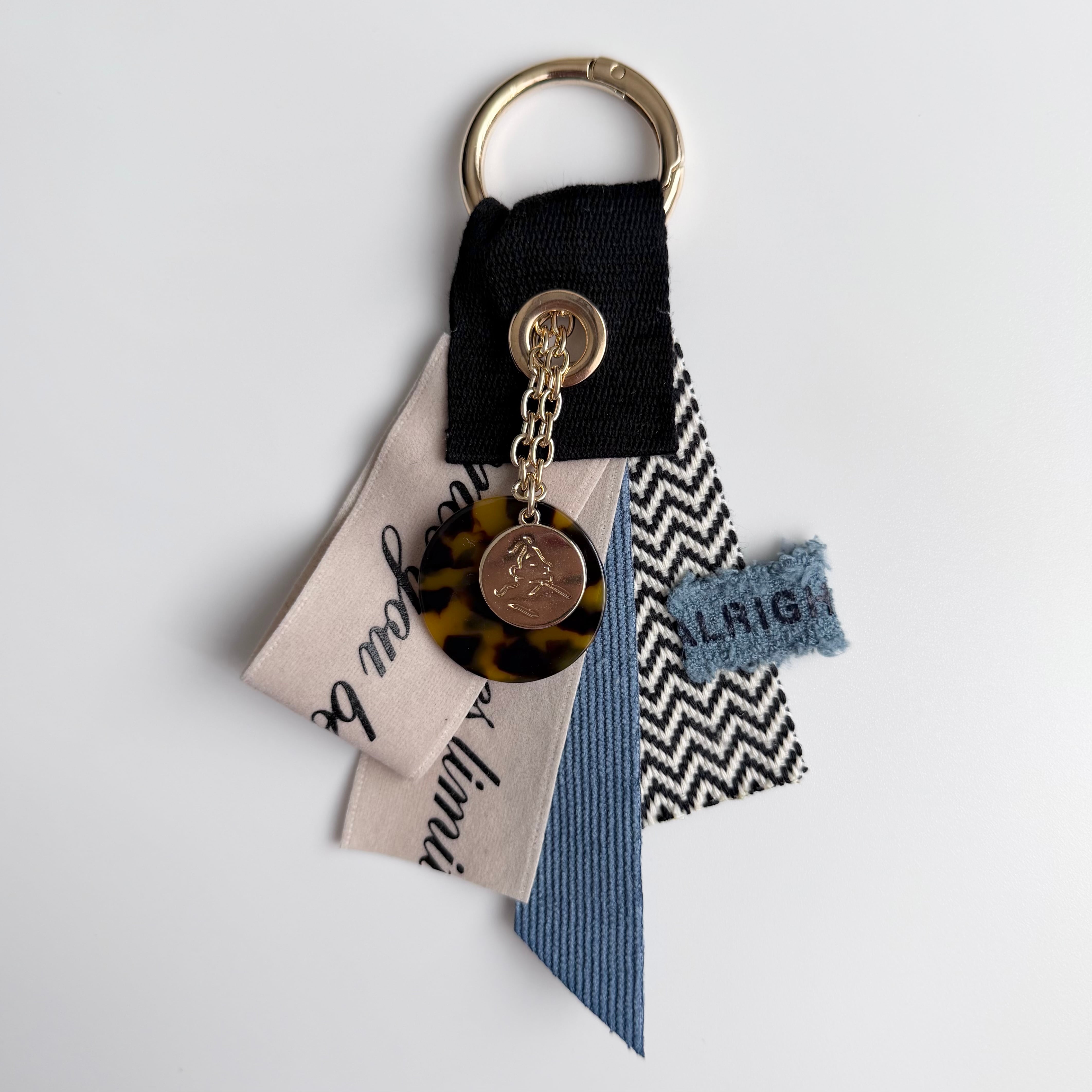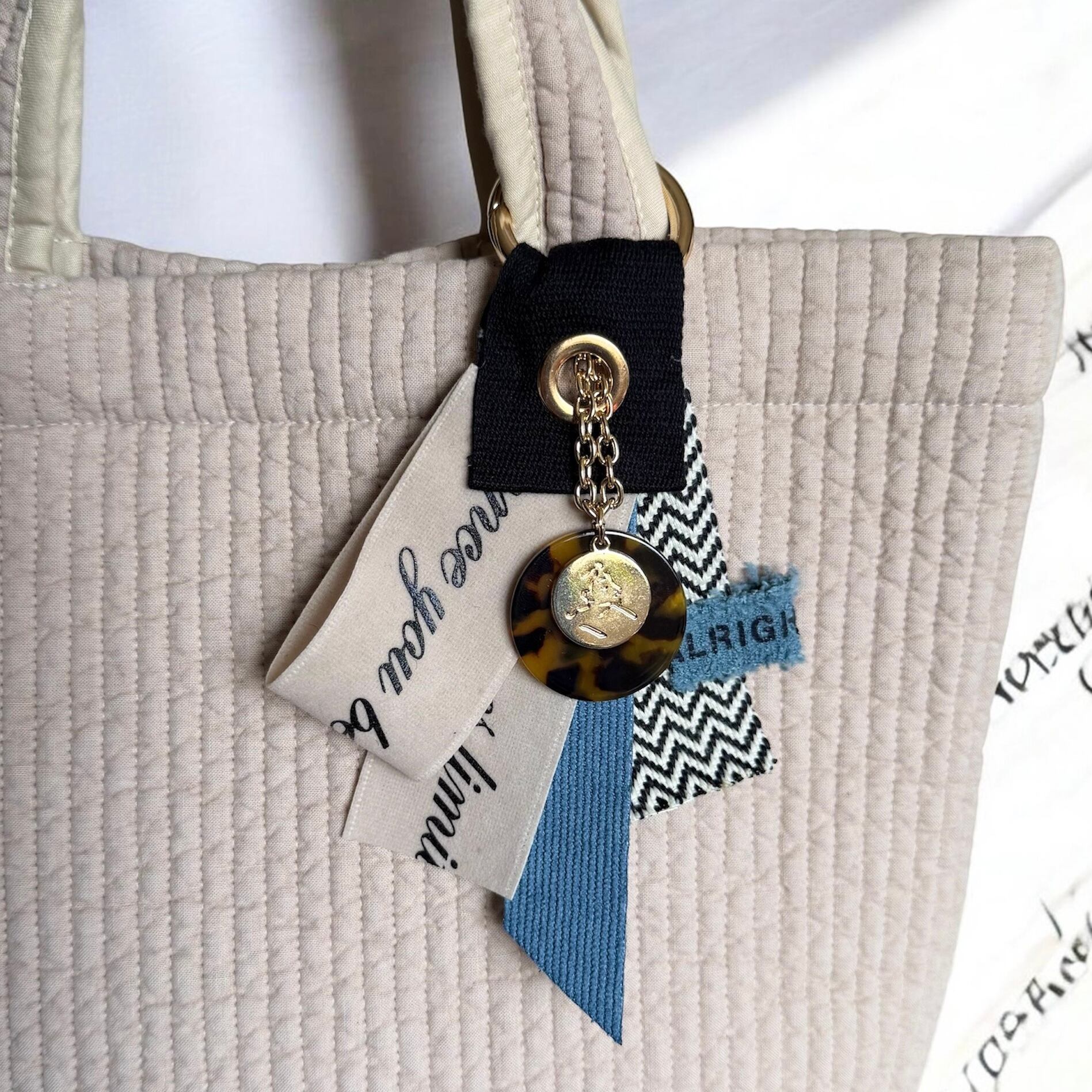 このリボンチャームは、べっ甲とゴールドプレートのコンビネーションが魅力のカジュアルでスタイリッシュなデザインが特徴です。デニムとのベージュリボンの組み合わせが、あなたのアイテムに華やかなエッセンスを加え、普段のコーディネートに新たな風を吹き込むでしょう♪