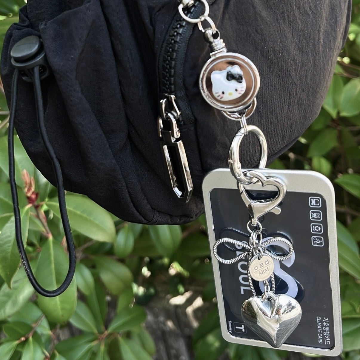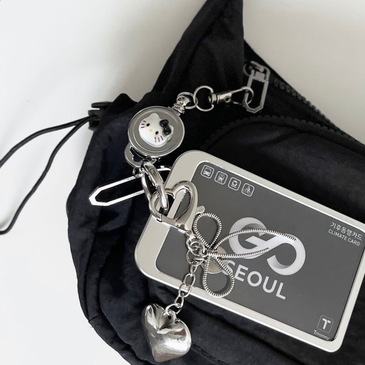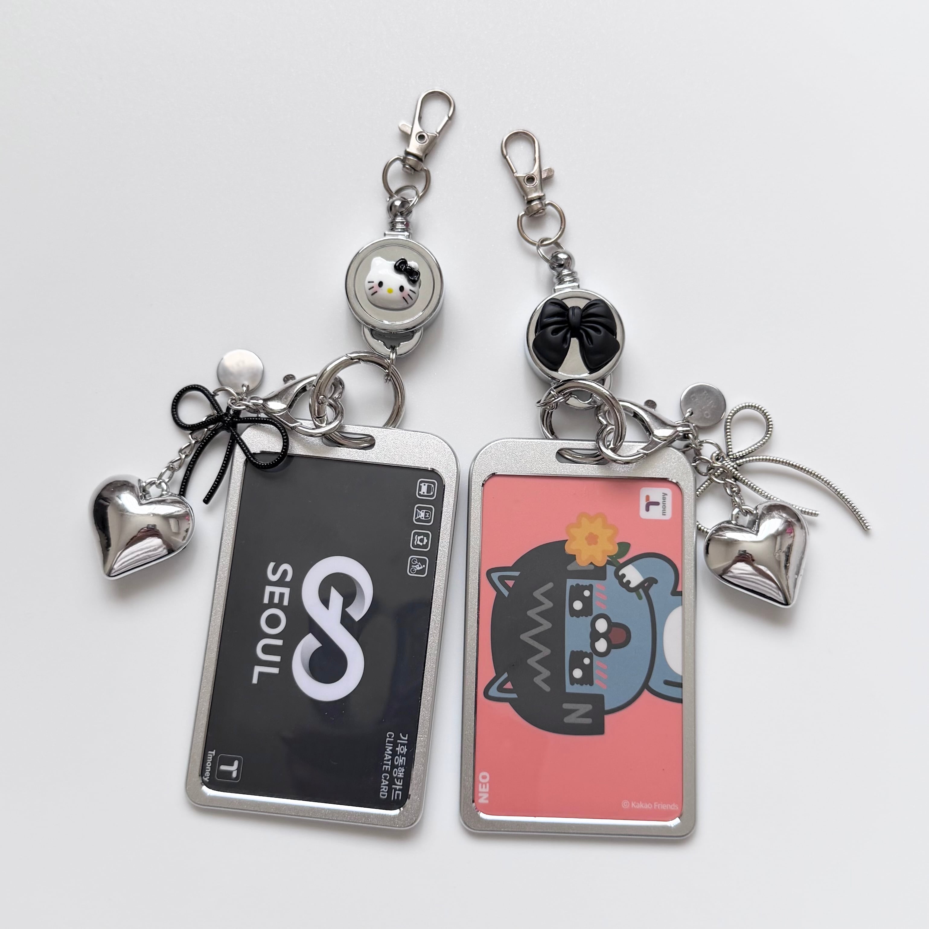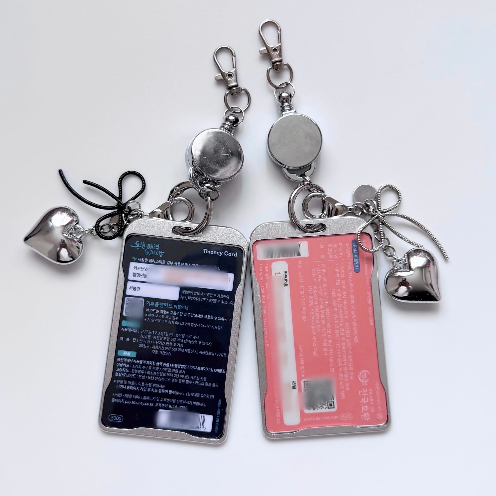 このカードホルダーチャームは、スタイリッシュなオールシルバーカラーが特徴のアイテムです。IDカードはもちろん、韓国旅行に必須の気候同行カード、さらにTMONEYカードや推しのチェキなどを自由に入れ替えることができ、デイリーでもお出かけでも様々なシーンで使い勝手抜群のアイテム♪